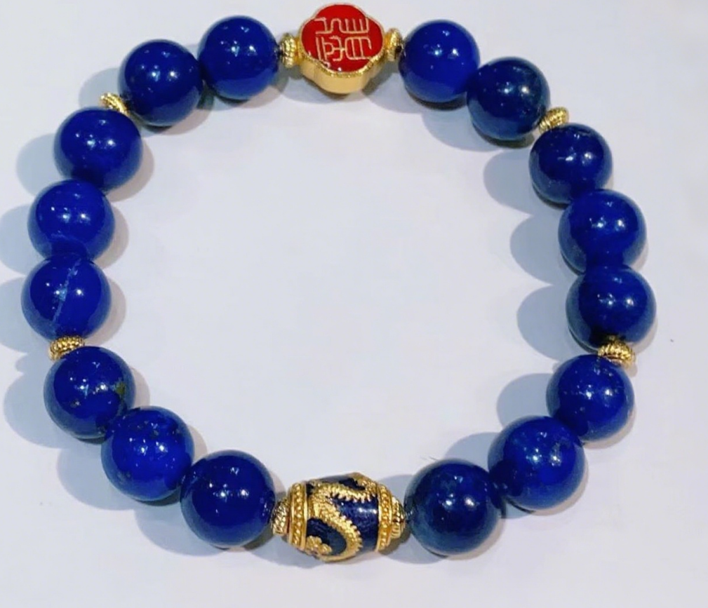 This bracelet combines natural lapis lazuli beads with a dragon-inspired centerpiece design. It symbolizes strength, wisdom, and cultural artistry, making it both a decorative accessory and a meaningful gift.