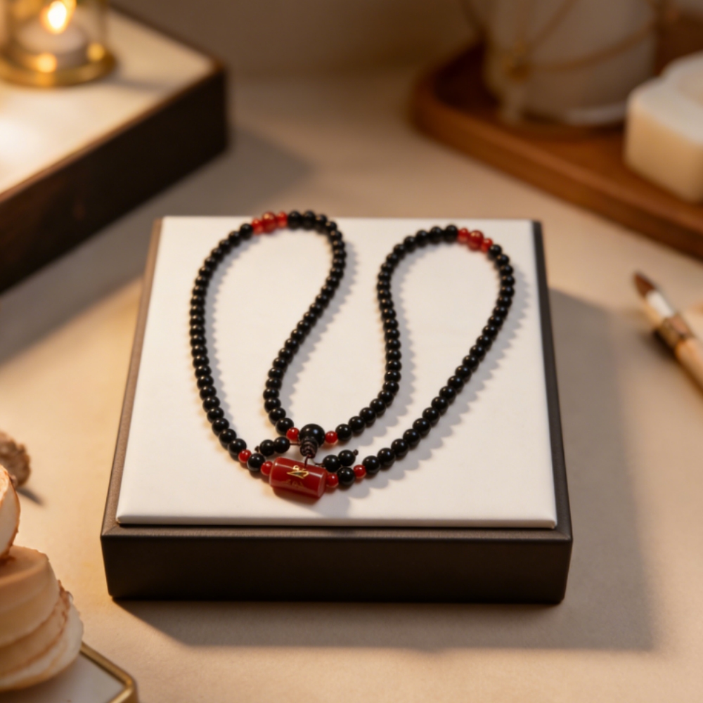 Crimson and ebony interweave, double loops embrace the neck, embodying peace and strength.